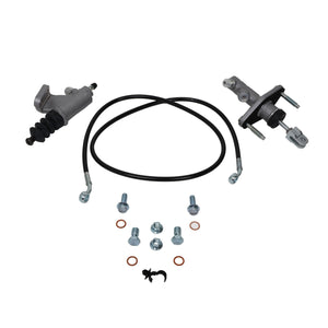The Hybrid Racing Clutch Master Cylinder Upgrade kit for the 2004-2008 Acura TSX is a straightforward bolt-on part that includes an OE Nissin CMC, a stainless braided clutch line with fittings, and a stand-off for mounting the clutch line. No additional replacement parts or parts from the factory CMC are required. The kit has the necessary grease to lubricate the clevis pin and prevent NVH (noise, vibration, and harshness).